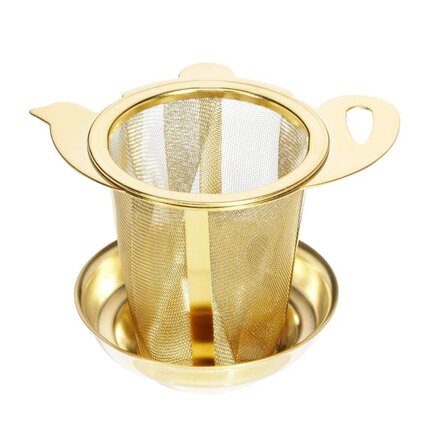 Gold steel mesh mug infuser with drip tray strainer