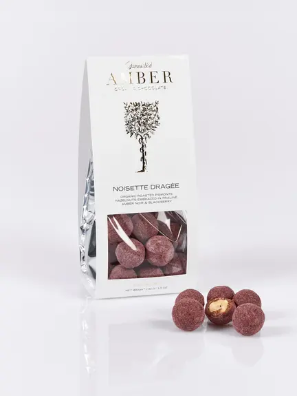 Let ristede økologiske italienske hasselnødder, drageret i praliné, Amber Noir-chokolade og vendt i det fineste pulver af solmodne brombær. En hasselnød med frugtighed og syre fra de solmodne brombær, dybde fra den karamelliserede Amber Noir-chokolade og umami fra de sprøde italienske hasselnødder