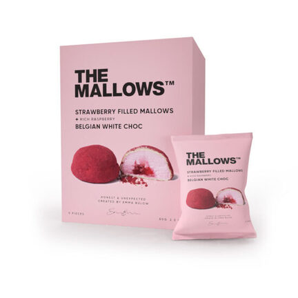 Strawberry Filled Mallows + Rich Raspberry & Belgian White Choc er chewy skumfiduser med cremet jordbærfyld, overtrukket med silkeblød belgisk hvid chokolade og afsluttet med et strejf af intenst hindbærpulver. En elegant og frugtig smagskombination, der frister fra første bid.